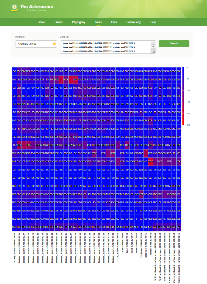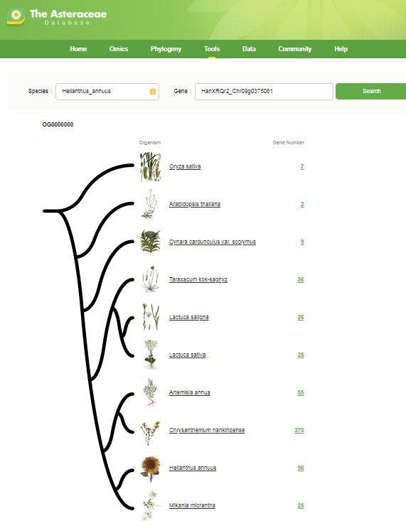 Users can select a species in poll-down menu, and input a gene id. The results show the orthologous genes in Arabidopsis thaliana, Oryza sativa and eight Asteraceae species. After clicking on ‘Gene Number’, gene list will be returned in a new page.